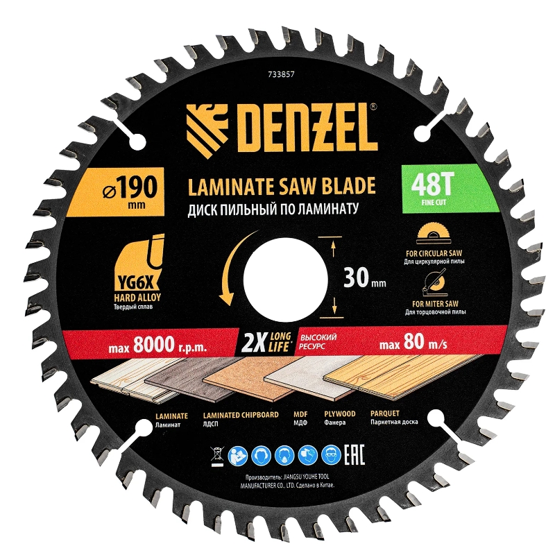 Пильный диск по ламинату Denzel 733857, ф190 х 30 мм, 48 зубьев