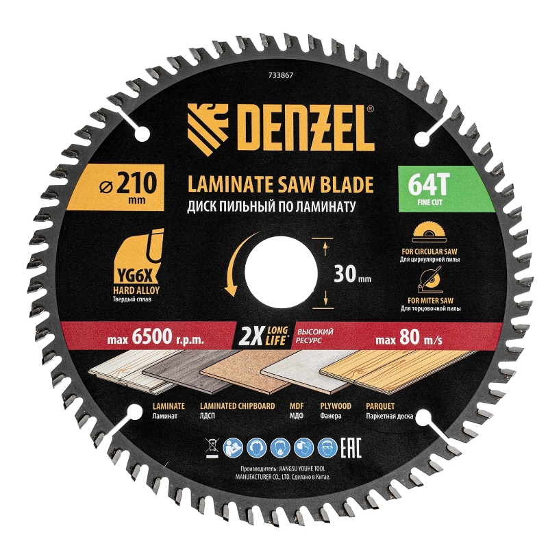 Пильный диск по ламинату Denzel 733867, ф210 х 30 мм, 64 зубьев