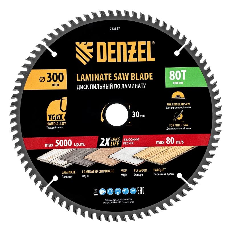 Пильный диск по ламинату Denzel 733887, ф300 х 30 мм, 80 зубьев
