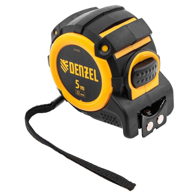 Рулетка Denzel 31523, 5м х 32мм,автоматическая фиксация, нейлоновое покрытие, магнитный зацеп, двухсторонняя разметка предназначена для измерения расстояний и определения габаритов различных предметов. Лента автоматически фиксируется в вытянутом положении, что упрощает работу. Рулетка удобна для работы в труднодоступных местах, будет полезна во время строительных и ремонтных работ.Преимущества Прочность — двухкомпонентный корпус изготовлен из ABS-пластика и термопластичной резины, что снижает риск его поломки в результате случайного падения или удара Четкая шкала — измерительное полотно с нейлоновым покрытием устойчиво к истиранию Функциональность — магнитный зацеп надежно фиксируется на металлических поверхностях Проведение измерений в разных плоскостях — на ленту нанесена двухсторонняя разметка (вертикальная и горизонтальная шкала) Эргономичность — у рулетки имеется 2 кнопки возврата измерительной ленты, что ускоряет работу