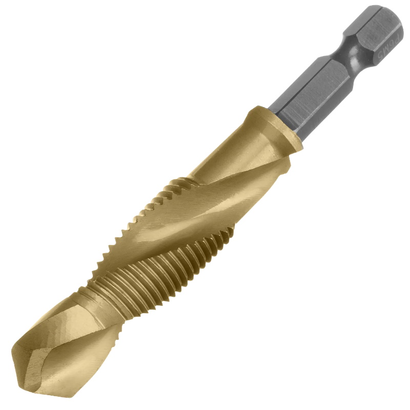 Сверло-метчик Denzel 76726, М12х1.25 мм, Р6М5 - предназначено для получения глухих и сквозных отверстий в металлических заготовках с одновременным нарезанием правой резьбы M12 с шагом 1.25 мм. Позволяет существенно сэкономить время работы, объединив две операции в одну. Угол заточки 135° оптимален для работы с чугуном, сталью, алюминием, медью, бронзой. Ресурс оснастки увеличен в 10 раз по сравнению с аналогичными моделями из углеродистой стали.Преимущества Прочность — оснастка из быстрорежущей стали обеспечивает высокую эффективность работы в течение длительного времени Долговечность — нитридтитановое покрытие защищает от повреждений и уменьшает трение, что увеличивает устойчивость сверла-метчика к износу Быстрое засверливание — благодаря подточенной поперечной кромке можно приступать к работе без предварительной разметки поверхности (накернивания) Высокое качество выполняемых работ — сверлу-метчику присвоен класс точности 4H Удобный поиск среди других инструментов — на хвостовик нанесена лазерная гравировка с обозначением типоразмера Надежная фиксация — шестигранный хвостовик не проворачивается в патроне электроинструмента