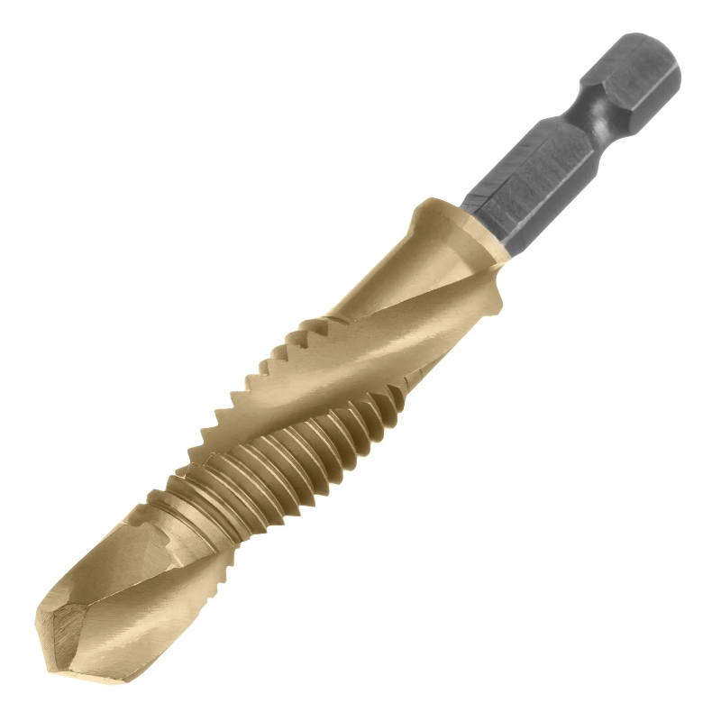 Сверло-метчик Denzel 76727 из стали P6M5 предназначено для получения глухих и сквозных отверстий в металлических заготовках с одновременным нарезанием правой резьбы M12 с шагом 1,75 мм. Позволяет существенно сэкономить время работы, объединив две операции в одну. Угол заточки 135° оптимален для работы с чугуном, сталью, алюминием, медью, бронзой. Ресурс оснастки увеличен в 10 раз по сравнению с аналогичными моделями из углеродистой сталиПреимущества Прочность — оснастка из быстрорежущей стали обеспечивает высокую эффективность работы в течение длительного времени Долговечность — нитридтитановое покрытие защищает от повреждений и уменьшает трение, что увеличивает устойчивость сверла-метчика к износу Быстрое засверливание — благодаря подточенной поперечной кромке можно приступать к работе без предварительной разметки поверхности (накернивания) Высокое качество выполняемых работ — сверлу-метчику присвоен класс точности 4H Удобный поиск среди других инструментов — на хвостовик нанесена лазерная гравировка с обозначением типоразмера Надежная фиксация — шестигранный хвостовик не проворачивается в патроне электроинструмента
