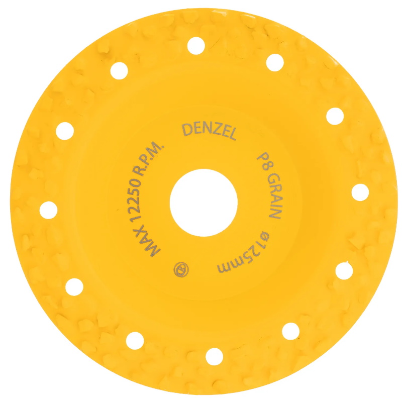 Твердосплавная зачистная чашка Denzel 72974 плоской формы, диаметром 125 мм, с крупным абразивным зерном P8, — оснастка для углошлифовальной машины, предназначенная для проведения обдирочных работ. Оптимальна для грубой обработки твердой и мягкой древесины, пластика, резины, газобетона, кирпича. Позволяет быстро и эффективно выровнять поверхность, удалить старое лакокрасочное покрытие, остатки клея, цемента и т.д.Преимущества Эффективность — режущие частицы из твердого сплава карбида вольфрама ВК8 характеризуется высокими рабочими свойствами и не образует абразивной пыли Прочность — корпус изготовлен из стали 45 методом штамповки и устойчив к повреждениям Высокий ресурс — абразивные зерна надежно закреплены на основании методом вакуумной пайки, рабочая поверхность не подвержена засаливанию Производительность — в корпусе предусмотрены отверстия для отвода шлама, что обеспечивает высокую скорость работы и позволяет избежать перегрева оснастки Защита от коррозии — на чашку нанесено эмалевое покрытие Простой уход — после окончания работы достаточно очистить оснастку щеткой