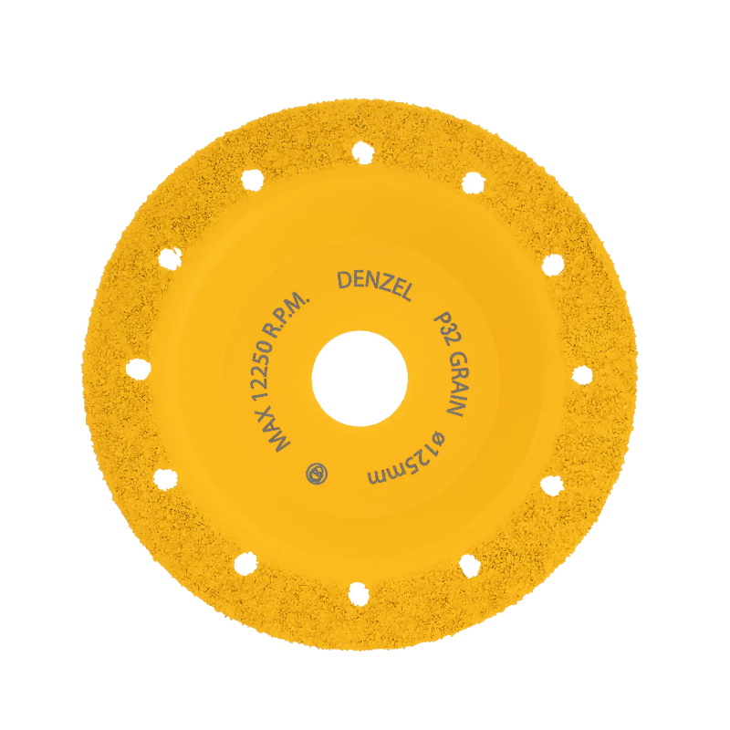 Чашка твёрдосплавная зачистная Denzel 72978, 125 мм, плоская, мелкое зерно #32 - используется для проведения шлифовальных работ при помощи углошлифовальной машины (УШМ). Мелкозернистый абразив оптимален для чистовой обработки твердой и мягкой древесины, кирпича, пластика, резины, газобетона. С помощью чашки можно устранить мелкие неровности, остатки старого покрытия, подготовить поверхности к дальнейшей отделке. Режущие частицы из твердого сплава ВК8 не образуют абразивную пыль, что снижает вредное воздействие на здоровье пользователя. Оснастка пригодится при проведении строительных, ремонтных и отделочных работ.Преимущества Высокая режущая способность — твердосплавный абразив позволяет быстро и эффективно решать поставленные задачи Снижение нагрузки на УШМ — использование оснастки с облегченным корпусом позволяет избежать поломки инструмента Надежность — штампованный корпус из стали 45 отличается высокой прочностью Высокий ресурс — абразивные зерна надежно закреплены на основании методом вакуумной пайки, рабочая поверхность не подвержена засаливанию Производительность — в корпусе предусмотрены отверстия для отвода шлама, что обеспечивает эффективное охлаждение и высокую скорость работы Защита от коррозии — на чашку нанесено эмалевое покрытие Простой уход — после окончания работы достаточно очистить оснастку щеткой