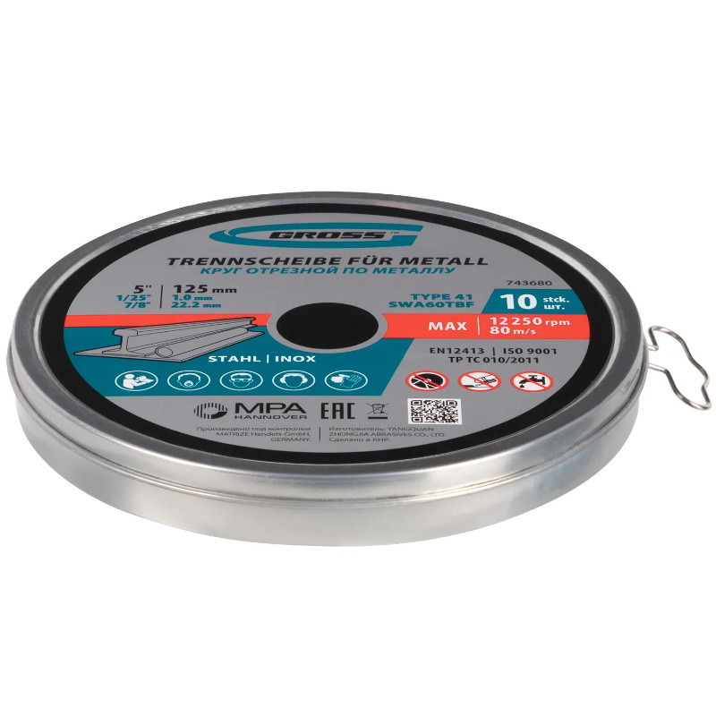 Отрезной круг по металлу Gross SWA60TBF 743680 размером 125 х 1,0 х 22,2 мм, 10 шт. в металлической банке, предназначен для интенсивного сухого реза нержавеющих легированных и углеродистых сталей, алюминия, чугуна. Устанавливается на УШМ соответствующего типоразмера. Крупнозернистый абразив F60 в сочетании с толщиной круга 1 мм обеспечивают высокую скорость и точность реза. Надежный и производительный, круг выдерживает высокие нагрузки, не требует частой замены и подходит для профессиональной эксплуатации.ПреимуществаОчень высокий ресурс — в бакелитовую связку и абразив включены специальные добавки, керамический корунд в составе увеличивает срок службы круга на 15%.Неизменно высокая эффективность — абразив из монокорунда с добавками характеризуется твердостью и прочностью, способен самозатачиваться в процессе работы.Надежность — круг изготовлен с использованием технологии Aging Sсhutz, препятствующей впитыванию влаги, благодаря чему сохраняет изначальные характеристики на 40% дольше.Безопасная работа — высококачественная двухслойная стеклосетка защищает круг от перегрузок, предотвращая его разрушение в случае зажатия в материале.Минимальное количество пыли и искр — благодаря специальному составу круг слабо нагревается в процессе реза, износ происходит медленно и равномерно.Стабильная и точная работа — круг с плотной равномерной структурой оптимально сбалансирован, что подтверждено дополнительным тестированием.Проверенное качество — круг прошел строгий контроль на каждом этапе производства, что подтверждено ганноверским и российским сертификатами безопасности. Удобная комплектация и упаковка — в металлической банке 10 кругов, которых хватит для выполнения большого объема работ.