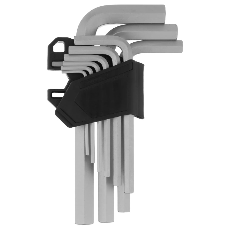 Набор ключей имбусовых Сибртех 123677, HEX, 2-12 мм, CrV, 9 шт., предназначенных для закручивания и откручивания крепежа со шлицем типа HEX. Набор пригодится для ремонта велосипедов, сборки мебели, установки и регулировки пластиковых окон.Преимущества Прочность — ключи из хромованадиевой стали твердостью 55 HRC легко справляются даже с заржавевшим крепежом Коррозионная стойкость — хромовое покрытие защищает ключи от разрушения Работа со значительным усилием — короткую часть можно использовать в качестве рабочей Комфортная работа — в держатель встроен намагничиватель, благодаря чему ключи надежно фиксируются в шлице евровинтов Продуманная упаковка — держатель-клипса из прочного пластика удобен для хранения и быстрого извлечения инструментов