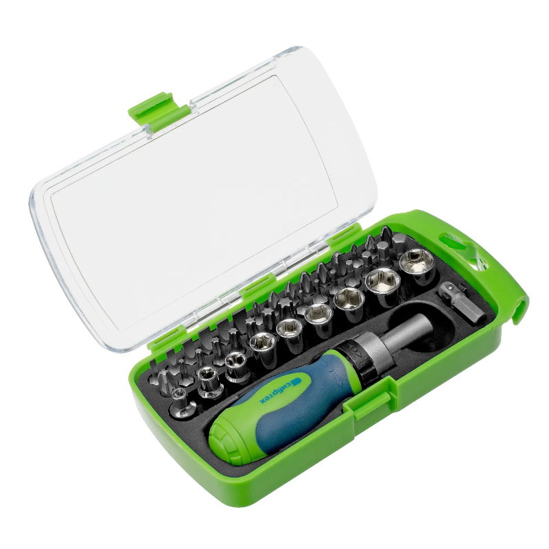 Отвертка Сибртех 133587 с двухкомпонентной рукояткой поставляется с битами и торцевыми головками и входит в набор из 41 предмета. Используется для работы с резьбовым крепежом с профилем SL, PH, PZ, TORX или HEX. Благодаря магнитному держателю можно быстро менять насадки, что позволяет быстро решать большое количество разных задач. Отвертка с насадками незаменима во время проведения ремонтных, строительных, монтажных и демонтажных работ.Преимущества Надежность — биты и торцевые головки изготовлены из высокопрочной и износостойкой стали CrV твердостью 55 HRC Высокая скорость работы — трехпозиционный реверсивный механизм упрощает и ускоряет работу, имеет 3 режима (закручивание, откручивание и нейтральный для использования в качестве обычной отвертки) Эргономичность — прорезиненная рукоятка обеспечивает комфортный хват и позволяет долго работать без ощущения усталости Надежная фиксация торцевых головок — благодаря металлическому шариковому замку адаптер с присоединительным размером 1/4″ крепко удерживает насадки Удобная упаковка — набор поставляется в ударопрочном кейсе с надежной защелкой и отверстием для подвесного хранения