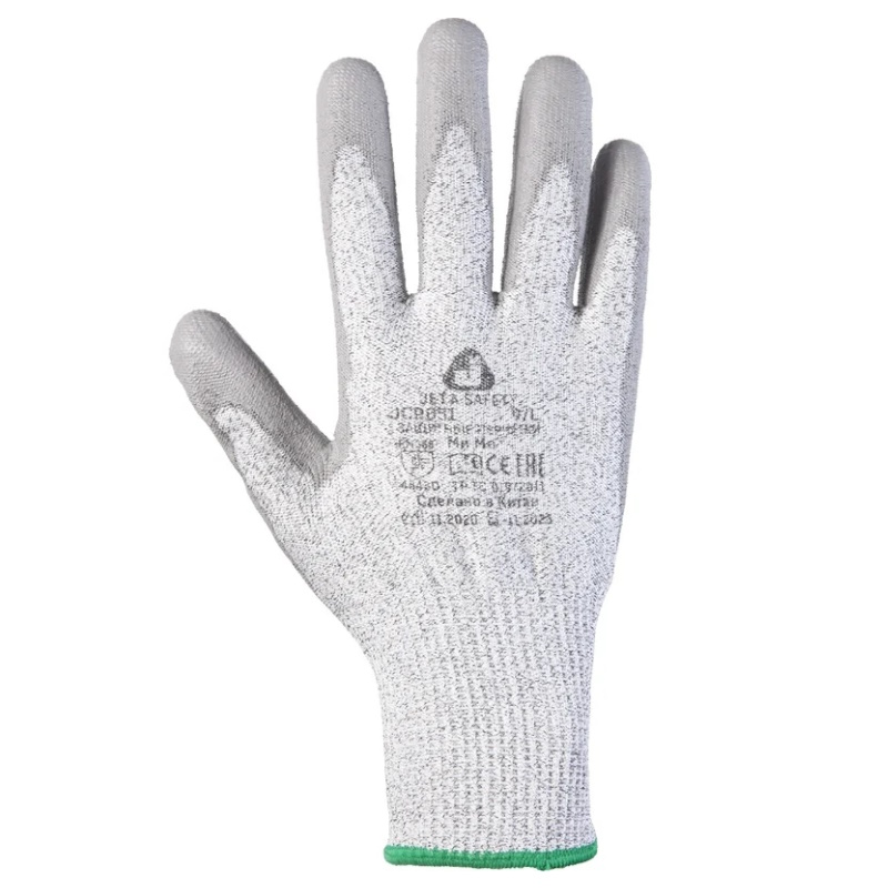 Перчатки промышленные защитные от порезов Jeta Safety JCP051-L, 5 класс, серые, размер L/9 — защитные промышленные перчатки от порезов (5 класс) с полиуретановым покрытием. Бесшовная перчатка выполнена из высокопрочных нитей полиэтилена (13 класс вязки). Эластичная манжета надёжно удерживает перчатку на запястье. Улучшенный воздухообмен обеспечивается благодаря отсутствию покрытия на внешней стороне ладони. Полиуретановое покрытие на ладони и пальцах устойчиво при работе с жирными масляными деталями. Перчатки обладают высокой износостойкостью. Степень защиты от механических повреждений 4543: 4 — устойчивость к истиранию, 5 — устойчивость к порезам, 4 — устойчивость к разрывам, 3 — устойчивость к проколам.Преимущества 5 класс защиты от порезов Полиуретановое покрытие устойчиво при работе с жирными масляными деталями Перчатки изготовлены из высокопрочных нитей полиэтилена (13 класс вязки) Высокая износостойкость и устойчивость к разрывам в соответствии с европейскими нормами EN388 Улучшенный воздухообмен Очень комфортные и практичные Эластичная манжета удерживает перчатку на запястье Защитные свойства: Ми, Мп