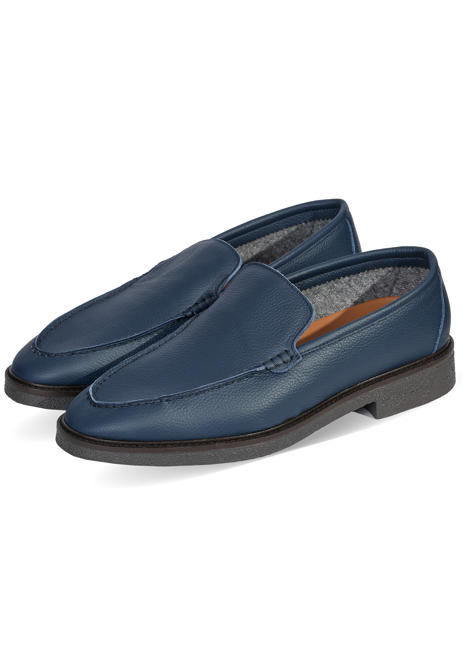 Кобальтовые лоферы, выполненные из мягкой пластичной кожи, представляют собой образец изысканного стиля и комфорта. Материал быстро адаптируется под форму стопы, обеспечивая ощущение удобства и идеальной посадки с первых же шагов. Слегка отполированная зернистая текстура придаёт обуви благородный матовый блеск, что делает ее визуально более привлекательной. Лаконичный силуэт модели подчеркивается передним фактурным швом вдоль овального мыска, добавляя изысканности и акцентируя внимание на качестве исполнения. Прочная подошва с наборным устойчивым каблуком обеспечивает надёжность и комфорт при каждом шаге, делая пару идеальной для длительного ношения.