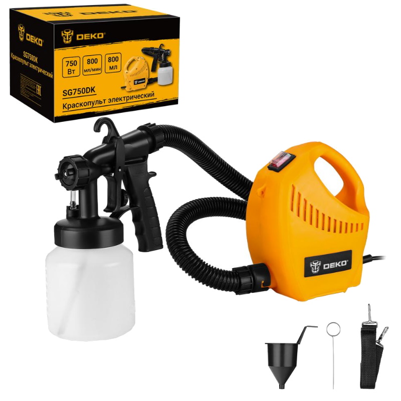 Краскопульт электрический Deko SG750DK 083-1127, 800 мл, 750 Вт - используется для обработки поверхности водно-меловыми и водно-известковыми составами при строительно-отделочных работах, при опрыскивании и побелке садов, дезинфекции помещений.Преимущества Мощный электродвигатель Регулируемая подача краски Съемный бак для краски Система быстрой очистки Эргономичная рукоятка Металлический корпус