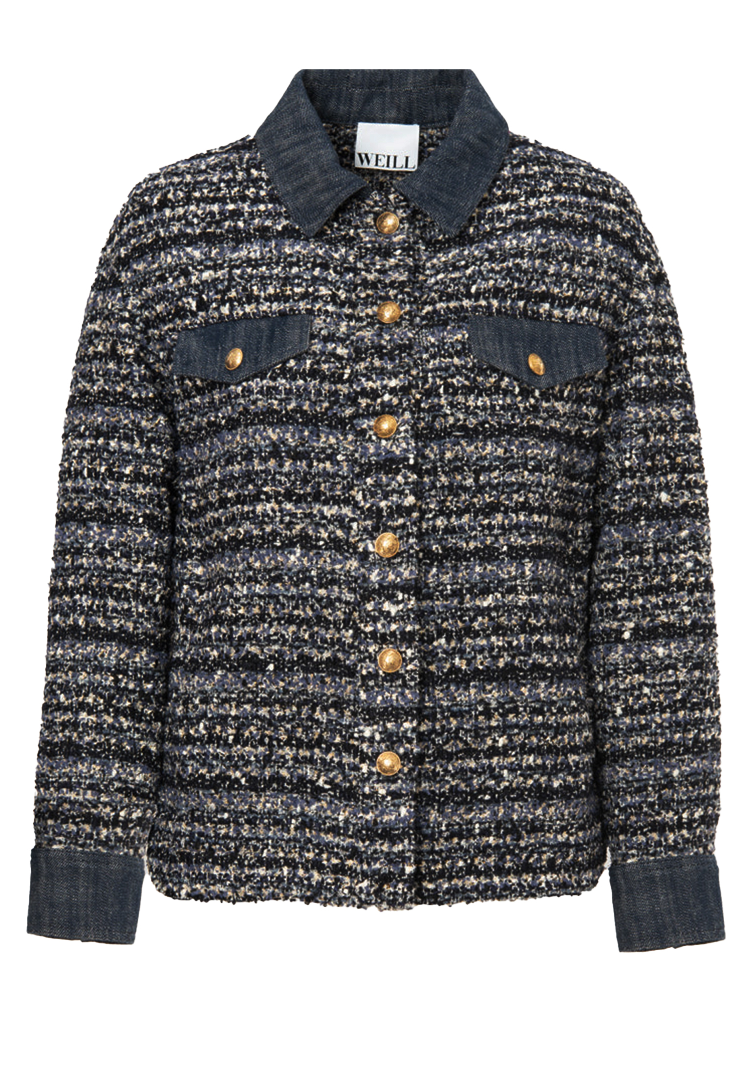 Эта рубашка от Weill — истинное воплощение ретро-шика, искусно сочетает в себе элегантность и современность. Изготовленная вручную, она представляет собой верхнюю рубашку из денима и твида, придающего ей уникальное текстурное ощущение, украшенное утонченными нитями люрекса. Глубокий синий цвет ткани гармонично сочетается с ослепительными золотыми пуговицами, фирменным элементом Weill, отсылая к наследию бренда, основанного Альбертом Вайлем.