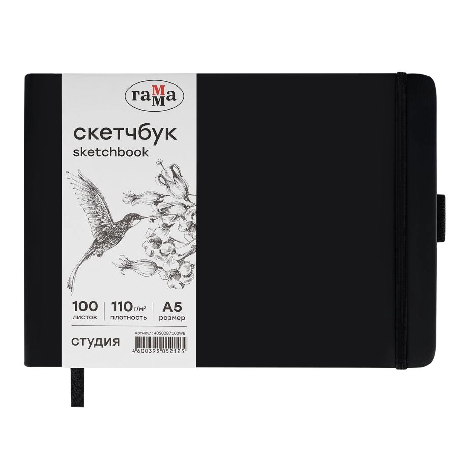 Скетчбук Гамма "Студия" 21х14,8 см 100 л 110 г, черный, твердая обложка, на резинке, белая