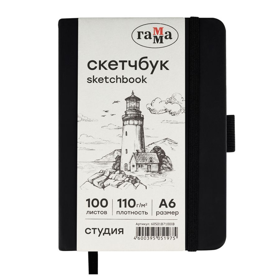 Скетчбук Гамма "Студия" А6 100 л 110 г, черный, твердая обложка, на резинке, слоновая кость