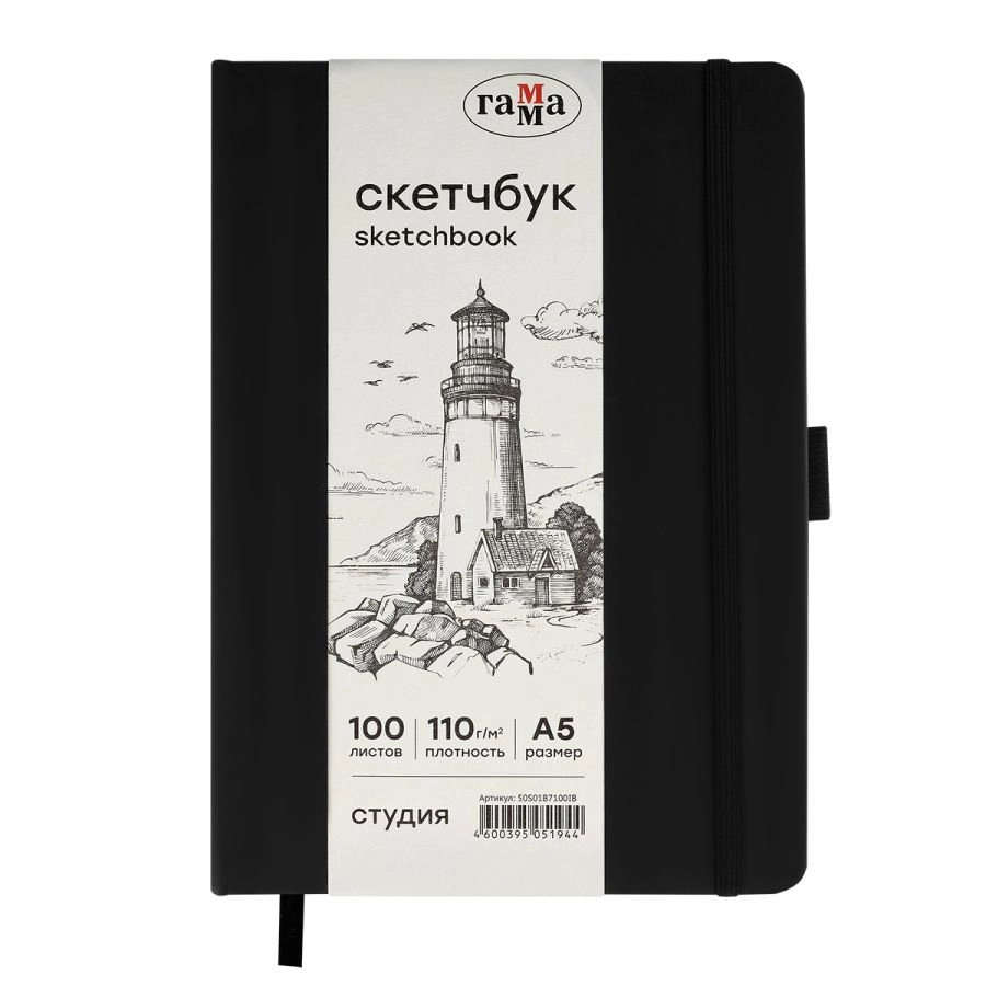 Скетчбук Гамма "Студия" А5 100 л 110 г, черный, твердая обложка, на резинке, слоновая кость