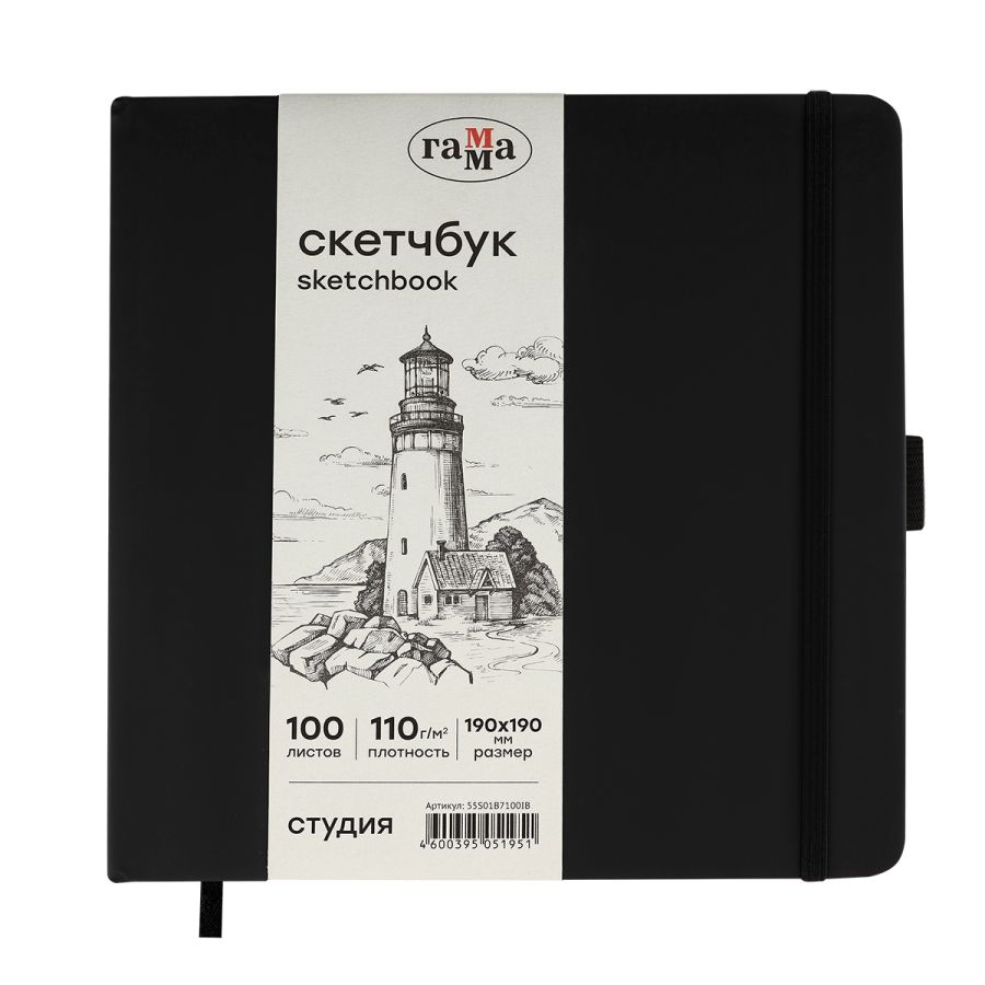Скетчбук Гамма "Студия" 19х19 см 100 л 110 г, черный, твердая обложка, на резинке, слоновая кость