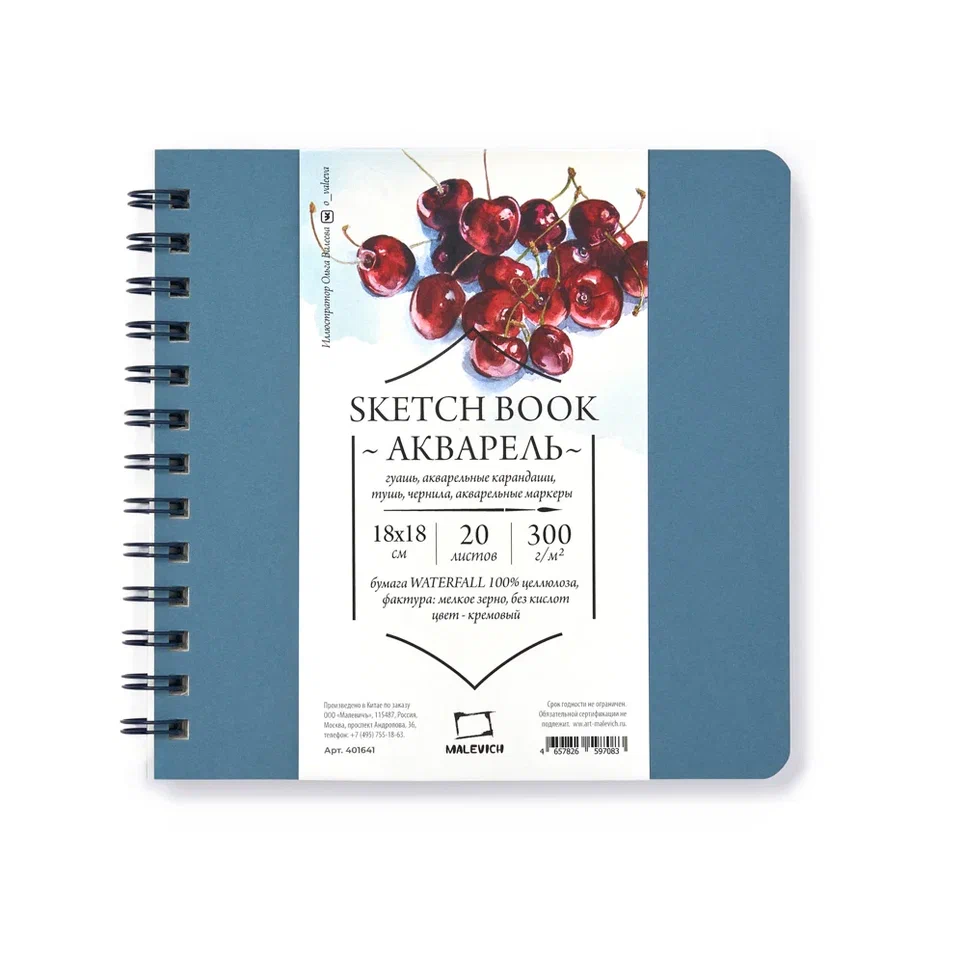 Скетчбук для акварели на спирали Малевичъ "WaterFall" 18х18 см 20 л 300 г, 100% целлюлоза