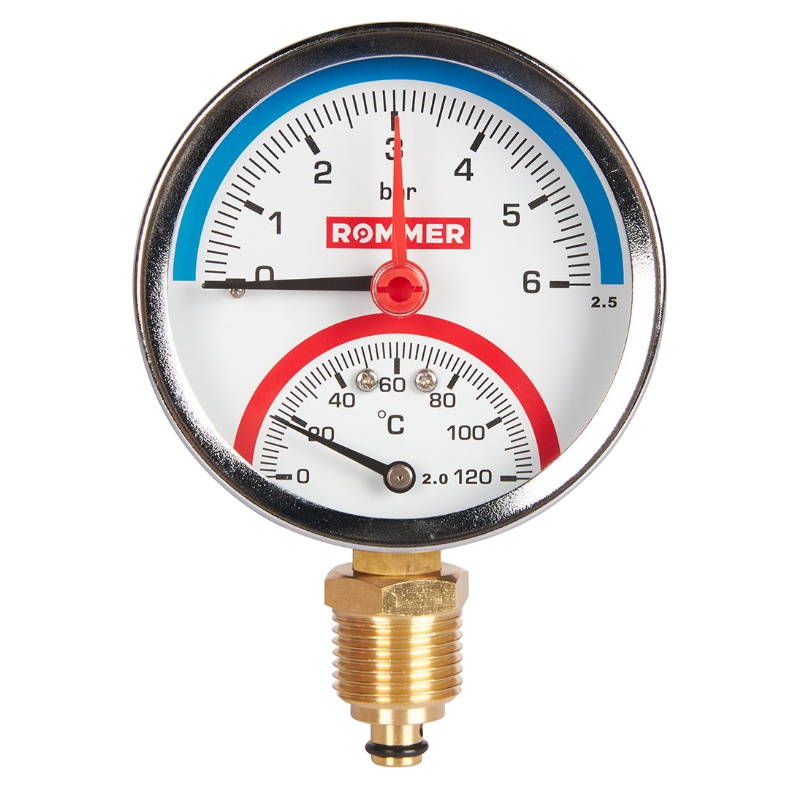 Термоманометр радиальный Rommer RIM-0006-800615 с автоматическим запорным клапаном, корпус Dn 80 мм, 1/2, 0-6 бар, 0...120°C - предназначен для контроля параметров теплоносителя в системах отопления.Преимущества Универсальность – одновременный контроль двух параметров Надежность – встроенный запорный механизм Точность измерений – градуировка шкал Долговечность – качественные материалы изготовления Простота установки – стандартный размер подключения