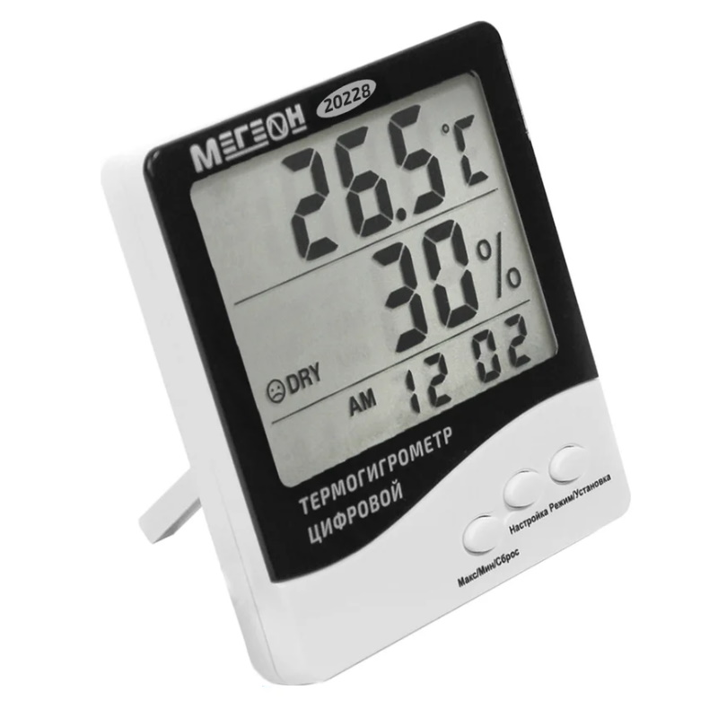 Термогигрометр настольный Мегеон 20228 к0000401764, цифровой с поверкой предназначен для измерения температуры и влажности в помещении.Преимущества Прибор имеет простой интерфейс и понятные настройки, а также оснащен большим высококонтрастным жидкокристаллическим дисплеем, на котором одновременно отображаются и измеренные температура и влажность, а также текущее время Благодаря современному эргономичному дизайну термогигрометр идеально впишется в интерьер любого дома, а функция фиксации минимального и максимального значений температуры будет полезной при использовании прибора в загородных домах, банях и складских помещениях Для отображения данных температуры доступно две единицы измерения: °C и °F Измеритель также успешно заменит настольные часы и станет незаменимым помощником, способным заменить три отдельно взятых изделия: термометр, гигрометр и будильник