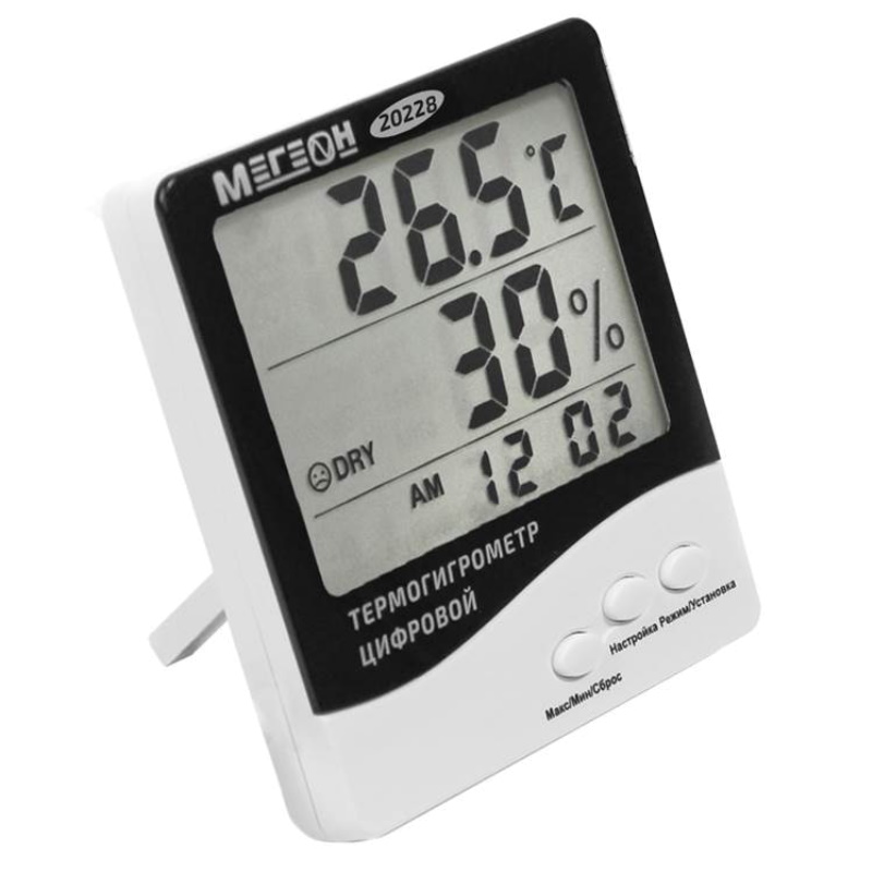 Термогигрометр Мегеон 20228 к0000395921, настольный, цифровой - прибор для измерения температуры и влажности в помещении.Преимущества Прибор внесён в ГРСИ по номером 89786-23 и имеет простой интерфейс и понятные настройки, а также оснащен большим высококонтрастным жидкокристаллическим дисплеем, на котором одновременно отображаются и измеренные температура и влажность, а также текущее время Благодаря современному эргономичному дизайну термогигрометр идеально впишется в интерьер любого дома, а функция фиксации минимального и максимального значений температуры будет полезной при использовании прибора в загородных домах, банях и складских помещениях Для отображения данных температуры доступно две единицы измерения: °C и °F Измеритель также успешно заменит настольные часы и станет незаменимым помощником, способным заменить три отдельно взятых изделия: термометр, гигрометр и будильник