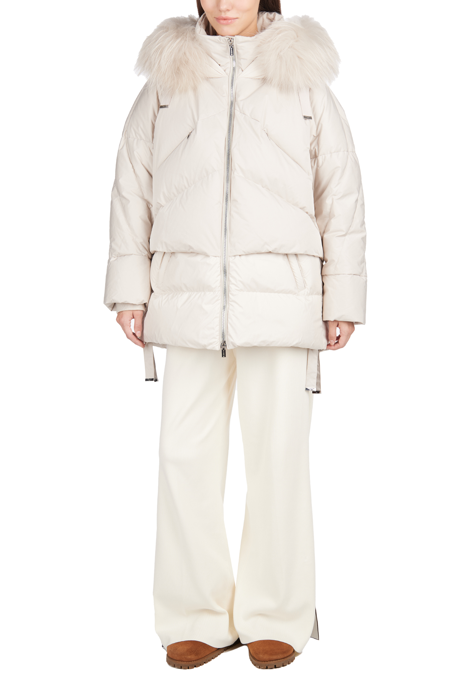 Элегантный кремовый цвет подчеркивает утонченность и изысканность, выделяя вас среди любого окружения. Модель прямого кроя обеспечивает свободу движений и современный, сдержанный силуэт. Воротник-стойка и капюшон на кулиске, украшенный пушистым мехом, не только добавляют роскоши, но и обеспечивают дополнительную защиту от холода.