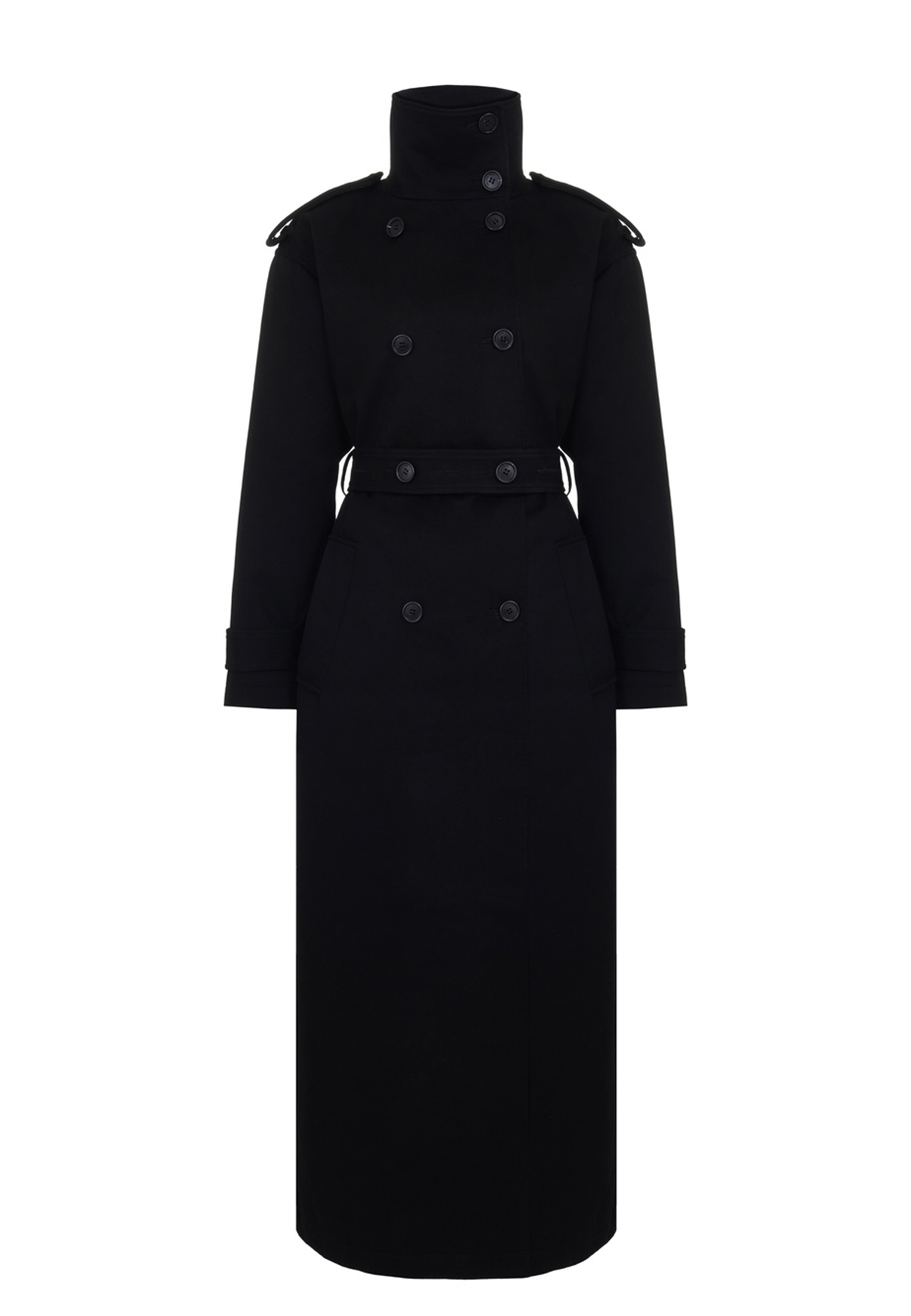Двубортный тренч прямого кроя длиной до щиколотки. Выполнен из плотного хлопка, удерживающего форму. Модель оснащена высоким воротником-стойкой, погонами на плечах и поясом для регулировки посадки. Лаконичный дизайн делает изделие универсальным для повседневных и более строгих образов.