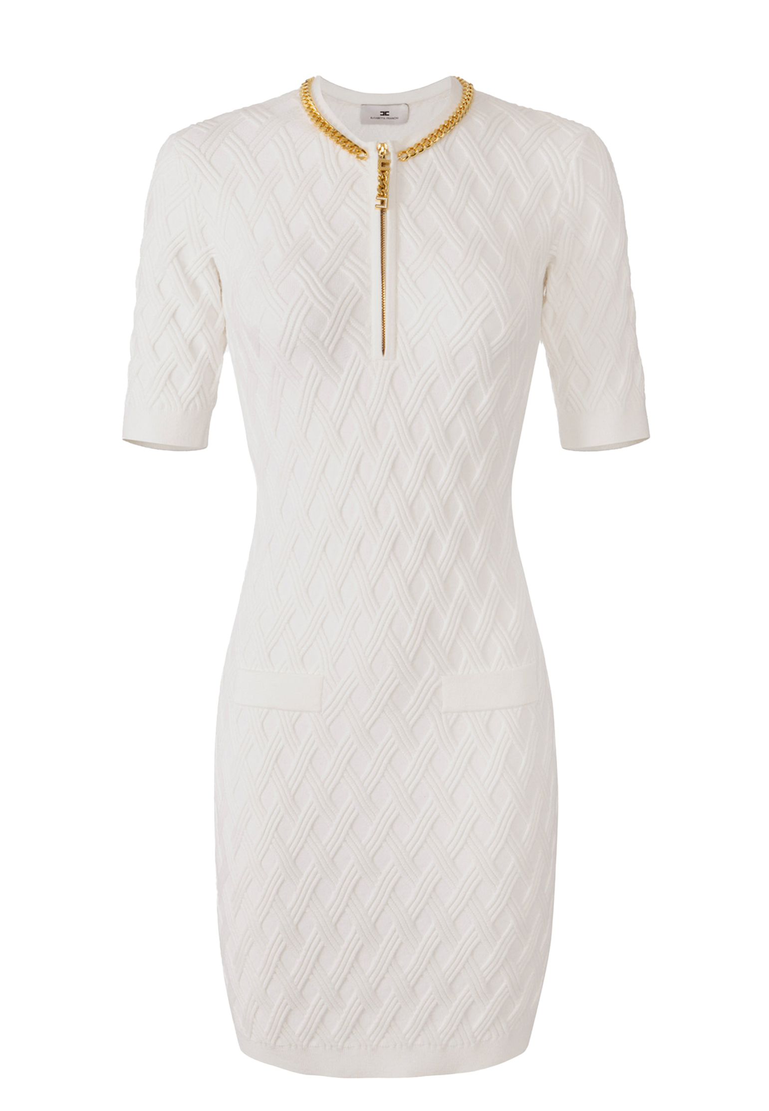 Это потрясающее платье от Elisabetta Franchi — истинное воплощение непринужденной элегантности и современного шика. Выполненное из трикотажного полотна изделие отличается своим белоснежным цветом и облегающим кроем, который подчеркивает каждую линию вашей фигуры, создавая грациозный силуэт. Геометрический 3D-узор в виде ромбов, выполненный по всей длине, придает глубину и визуальный интерес. Модель оснащена круглым вырезом горловины и рукавами выше локтя, что добавляет изысканности и классики. Эффектная цепочка с люверсами привносит современный городской акцент, в то время как молния с украшенным драгоценными камнями язычком, наделенным логотипом, добавляет роскоши и утонченного блеска. Золотистая металлическая деталь с драгоценными камнями подчеркнет ваш безупречный вкус и внимание к деталям. Спереди расположены ратные прорези, которые придают динамичность и уникальность. Это мини-платье — идеальный выбор для уверенных в себе женщин, стремящихся всегда быть в центре внимания, сохраняя при этом утонченную женственность и элегантность.