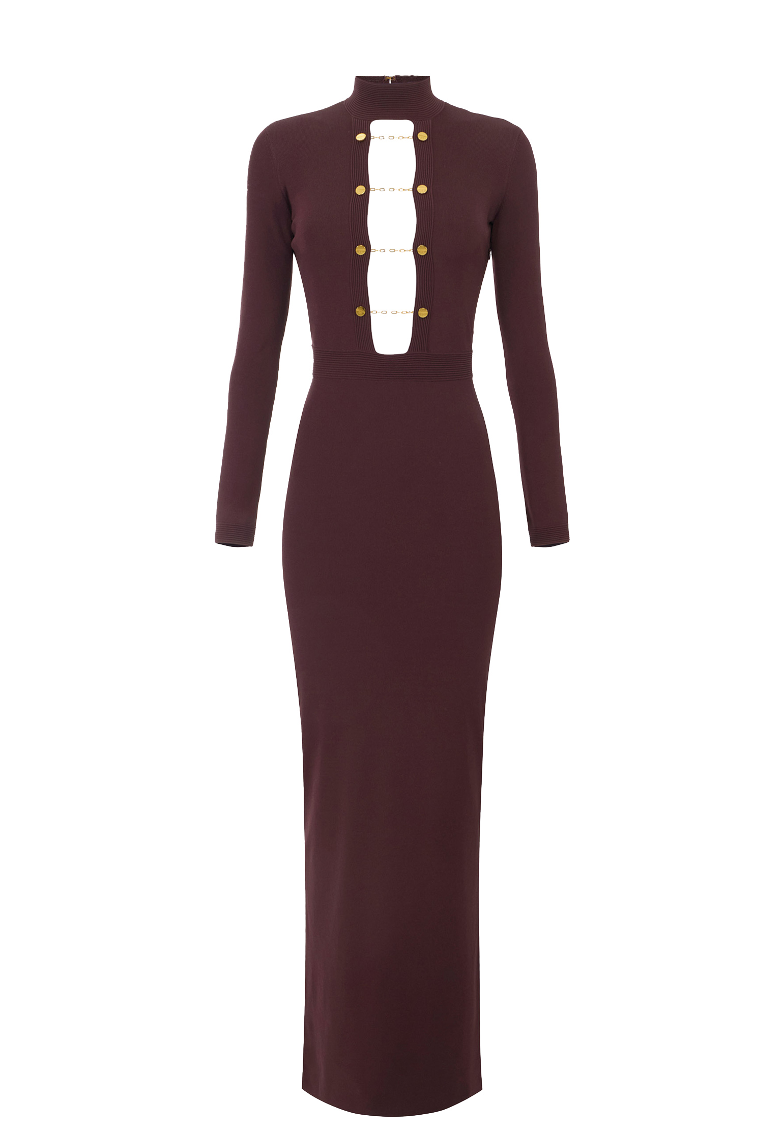 Высокий воротник и длинные рукава создают утонченное обрамление, которое контрастирует с глубоким V-образным вырезом спереди, украшенным великолепными запонками-драгоценностями и золотистой металлической цепочкой. Открытая спина придает образу дерзкую и современную нотку, изящно подчеркивая изысканный силуэт.