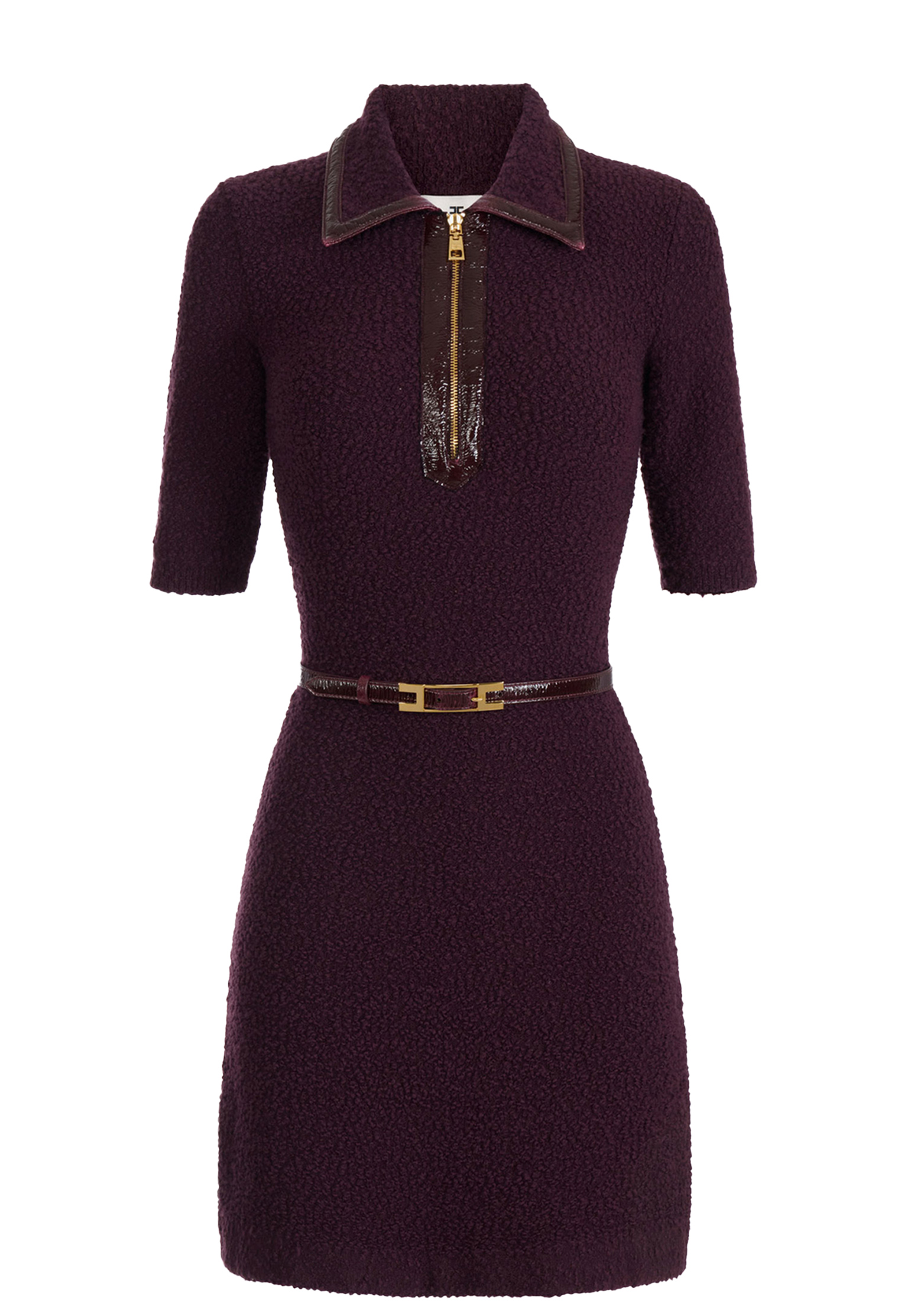Модель облегающего кроя подчеркивает фигуру, создавая утонченный силуэт. Рукава длиной выше локтя и воротник рубашки-поло акцентированы золотистой металлической молнией, привносящей гламурный блеск. Виниловые детали, такие как изысканная окантовка и пояс с логотипом, создают выразительный текстурный контраст, который выделяет этот наряд среди других.