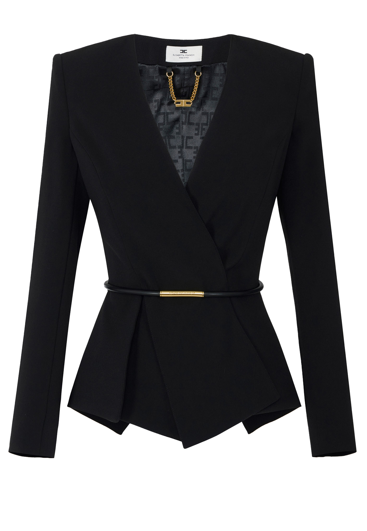 Этот черный жакет с поясом от Elisabetta Franchi — идеальное сочетание вечной классики и стиля городского шика. Изготовленный из легкого крепового материала, он воплощает непринужденную элегантность и привлекает внимание своим изысканным кроем. Модель имеет структурированные плечи и перекрёстный вырез горловины, который плавно переходит в широкие разрезы, образующие стильную баску. Трубчатый пояс на талии, украшенный логотипом, добавляет блеска и акцентирует фигуру. Подкладка из атласа с монограммой свидетельствует о выдающемся качестве и внимании к деталям, которое присуще бренду. Внутренняя застёжка обеспечивает идеальную посадку, а подплечники добавляют силу и уверенность в каждом движении. Это превосходный выбор для женщины, стремящейся к утонченности и статусу, который подходит для любых значимых мероприятий или деловых встреч.