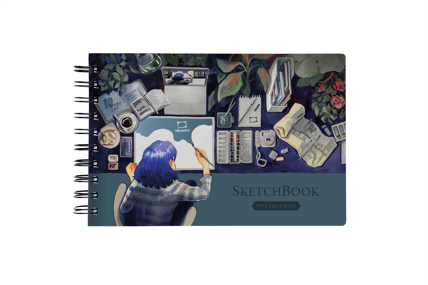 Акварельный скетчбук Малевичъ Юбилейный с бумагой Monet из 100% хлопка с экстра-мелким зерном плотностью 300 г/м, 20 листов. Скетчбук отлично подходит для рисования акварелью, акварельными карандашами, чернилами, гуашью и другими материалами.
