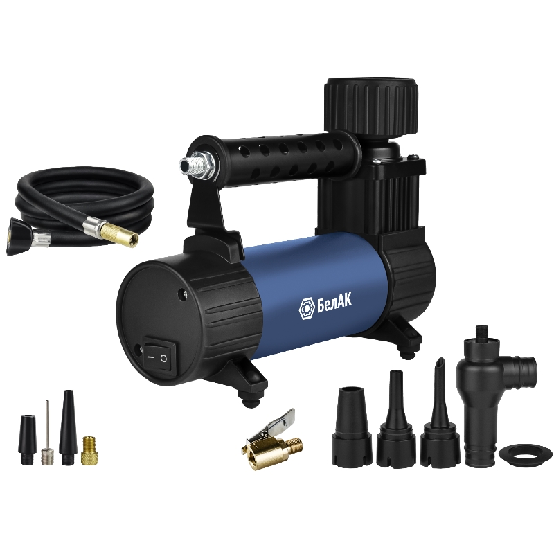 Компрессор автомобильный БелАК Х-СЕРИЯ БАК.99356 — компактный поршневой компрессор с производительностью 33 л/мин, работающий от 12 ВПреимущества Компактные размеры и небольшой вес обеспечивают удобство транспортировки и хранения Металлический корпус повышает износостойкость и долговечность Высокая надежность и стабильная работа благодаря медной обмотке двигателя Производительность 33 л/мин позволяет эффективно накачивать шины легковых автомобилей, велосипедов и надувные изделия Защита от перегрева увеличивает срок службы устройства Полный комплект насадок расширяет область применения компрессора Широкие ножки обеспечивают устойчивость во время работы