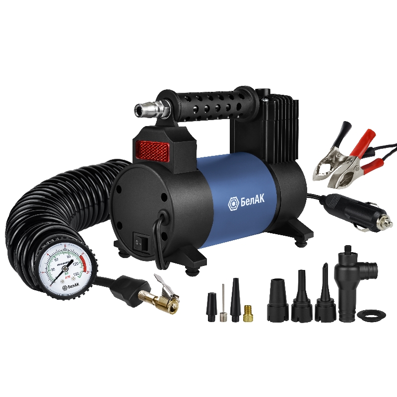Компрессор автомобильный БелАК Х-СЕРИЯ БАК.99354 — поршневой компрессор с производительностью 37 л/мин, работающий от 12 ВПреимущества Мощный и надежный двигатель с медной обмоткой гарантирует эффективную и стабильную работу компрессора Металлический корпус повышает долговечность и устойчивость к повреждениям Встроенный фонарь улучшает условия работы в темное время суток Большое количество насадок расширяет возможности использования компрессора для разных целей (шины, мячи, лодки, и пр.) Широкие ножки обеспечивают надежную устойчивость при работе Защита от перегрева продлевает срок службы устройства Компактные размеры и надежный кейс для удобства хранения и транспортировки