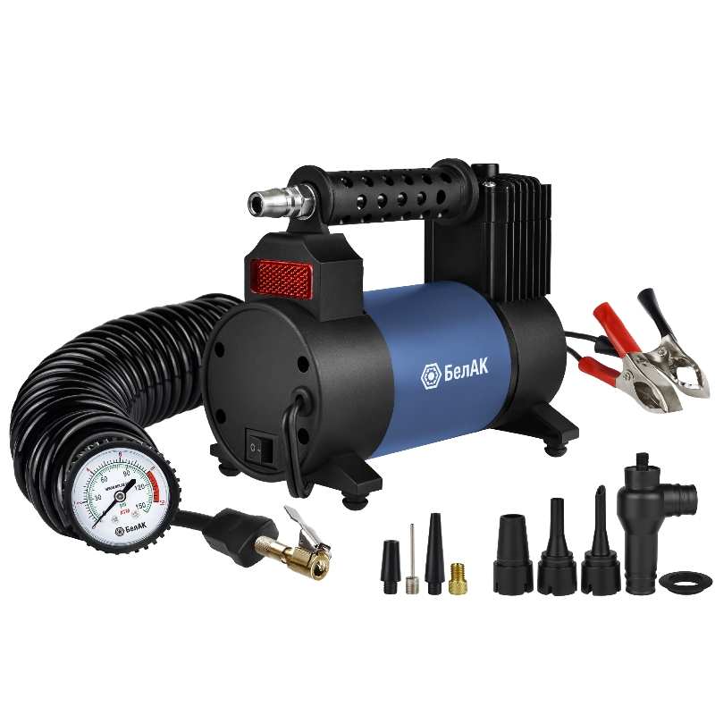 Компрессор автомобильный БелАК Х-СЕРИЯ БАК.99352 — поршневой компрессор с производительностью 55 л/мин и питанием от 12 В, предназначенный для быстрой и эффективной накачки шинПреимущества Высокая производительность 55 л/мин обеспечивает быструю накачку шин легковых автомобилей, велосипедов и другой техники Мотор с медной обмоткой стабильно работает длительное время без перегрева Металлический корпус и широкие ножки увеличивают надежность и устойчивость при эксплуатации Комплект насадок повышает универсальность устройства Удобство подключения и эксплуатации благодаря быстросъёмному фитингу и клапану-дефлятору Компактность и легкость хранения обеспечиваются тканевой сумкой Защита от перегрева повышает безопасность и долговечность компрессора