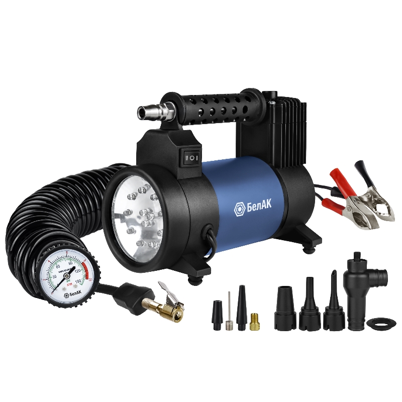 Компрессор автомобильный БелАК Х-СЕРИЯ БАК.99353 — это двухпоршневой компрессор с производительностью 55 л/мин, работающий от 12 В и оснащенный встроенным фонарикомПреимущества Высокая производительность обеспечивает быструю и эффективную накачку шин легковых и внедорожных автомобилей Мощный двигатель с медной обмоткой отличается надежностью и устойчивостью к перегреву Металлический корпус гарантирует долговечность и устойчивость к повреждениям Компактные размеры и небольшой вес повышают мобильность и удобство хранения Встроенный фонарик улучшает видимость и комфорт при работе в темное время суток Комплект насадок и тканевая сумка расширяют возможности применения и упрощают хранение Защита от перегрева и клапан-дефлятор обеспечивают безопасность и удобство эксплуатации