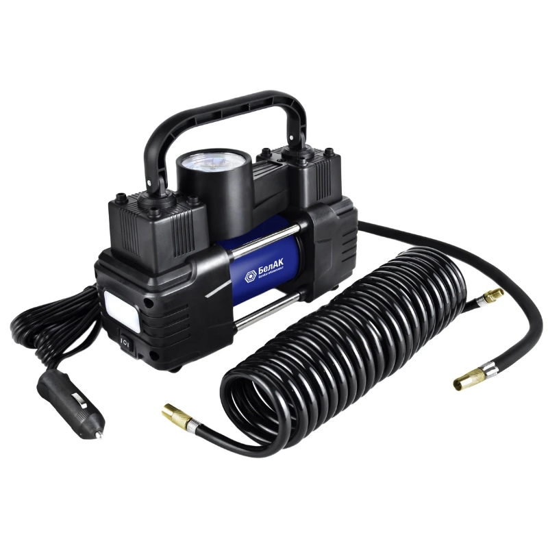 Компрессор для накачки шин БелАК ПРОФИ-55Ф БАК.99179 — мощный поршневой компрессор с производительностью 55 л/мин, работающий от 12 В и оснащённый встроенным фонарикомПреимущества Высокая производительность 55 л/мин позволяет быстро и эффективно накачивать шины легковых и внедорожных автомобилей Мощный двухпоршневой двигатель гарантирует долговечность и стабильную работу Длинный кабель и шланг обеспечивают свободу перемещения и удобство эксплуатации Встроенный фонарь повышает комфорт работы в темное время суток Надежное крепление наконечника и устойчивость корпуса повышают безопасность и удобство использования Компактный и легкий для удобства хранения и транспортировки Защита от короткого замыкания и перегрузок обеспечивает дополнительную безопасность