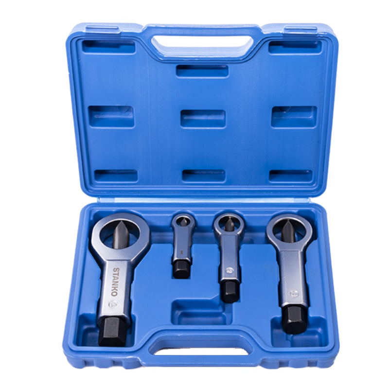 Набор гайколомов Stanko ST432, 4 предмета применяется при работе с крепежом, который невозможно демонтировать традиционным способомПреимущества Набор включает в себя инструмент, перекрывающий все самые распространенные размеры гаек. 9-12 мм/12-16 мм/16-22 мм/22-27 мм Высокая прочность конструкции. Корпус гайколомов изготовлен методом горячей ковки из качественной инструментальной стали, что обеспечивает долговечность и устойчивость к значительным нагрузкам при демонтаже Превосходное качество рабочей части. Режущие элементы выполнены из хромованадиевой стали (Cr-V), которая отличается повышенной износостойкостью. Специальная заточка и закалка до твердости 60-62 HRC гарантируют эффективное разрушение даже сильно заржавевшего или поврежденного крепежа