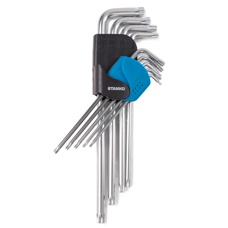 Набор угловых ключей Torx Stanko CS11129XL предназначен для работы с крепежом с внутренним профилем TORX. Монтаж / демонтаж крепежа различных изделий, устройств и агрегатов. Применяется на станциях технического обслуживания (СТО), автосервисах, автомастерских, в промышленности, производстве, строительстве.Преимущества Двусторонний профиль ключа позволяет применять его в различных положениях и в труднодоступных местах Пластиковый держатель поможет удобно разместить набор в районе рабочего места, а также держать инструменты набора в порядке и сохранности Набор включает в себя ключи следующих размеров: T10, T15, T20, T25, T27, T30, T40, T45, T50 Ключи изготовлены из высококачественной инструментальной легированной хром-ванадиевой стали. Технология горячей ковки и термической обработки ключей придаёт им особую прочность и высокую надёжность