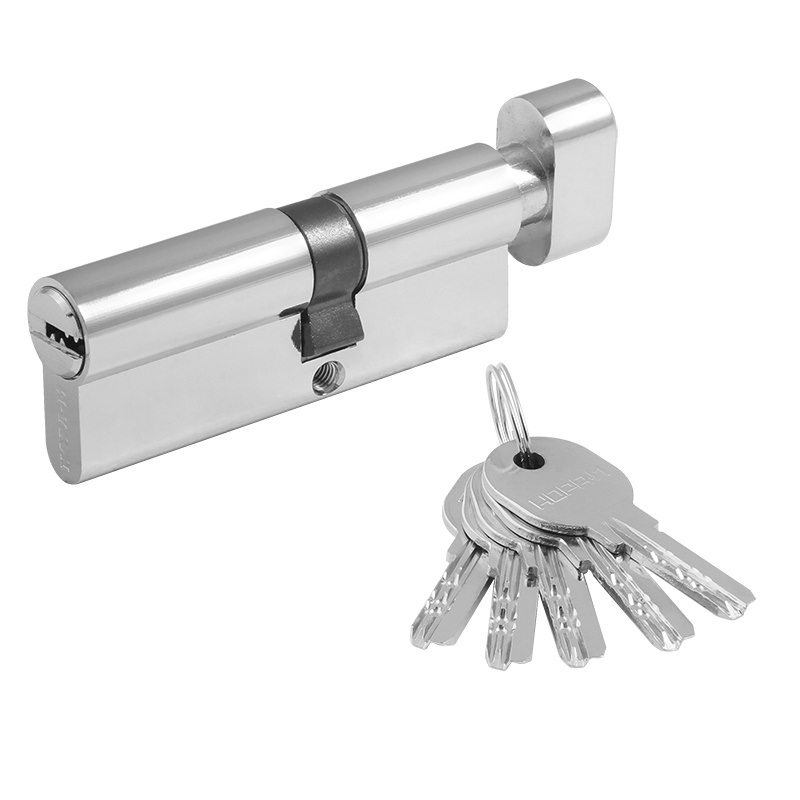 Цилиндр замка Нора-М , личинка ЛПУВ, асимметричный, с вертушкой, хром - латунный цилиндр для межкомнатных и входных дверей.Преимущества 6 пинов, в комплекте 5 перфорированных ключей из латуни Цилиндр имеет штифт из закаленной стали против высверливания и вертушку для удобного запирания изнутри помещения без использования ключа Ресурс работы более 100.000 циклов Цилиндр асимметричный, то есть имеет разное соотношение сторон по длине относительно центра Длину цилиндра подбирайте исходя из толщины двери, с небольшим запасом под накладку