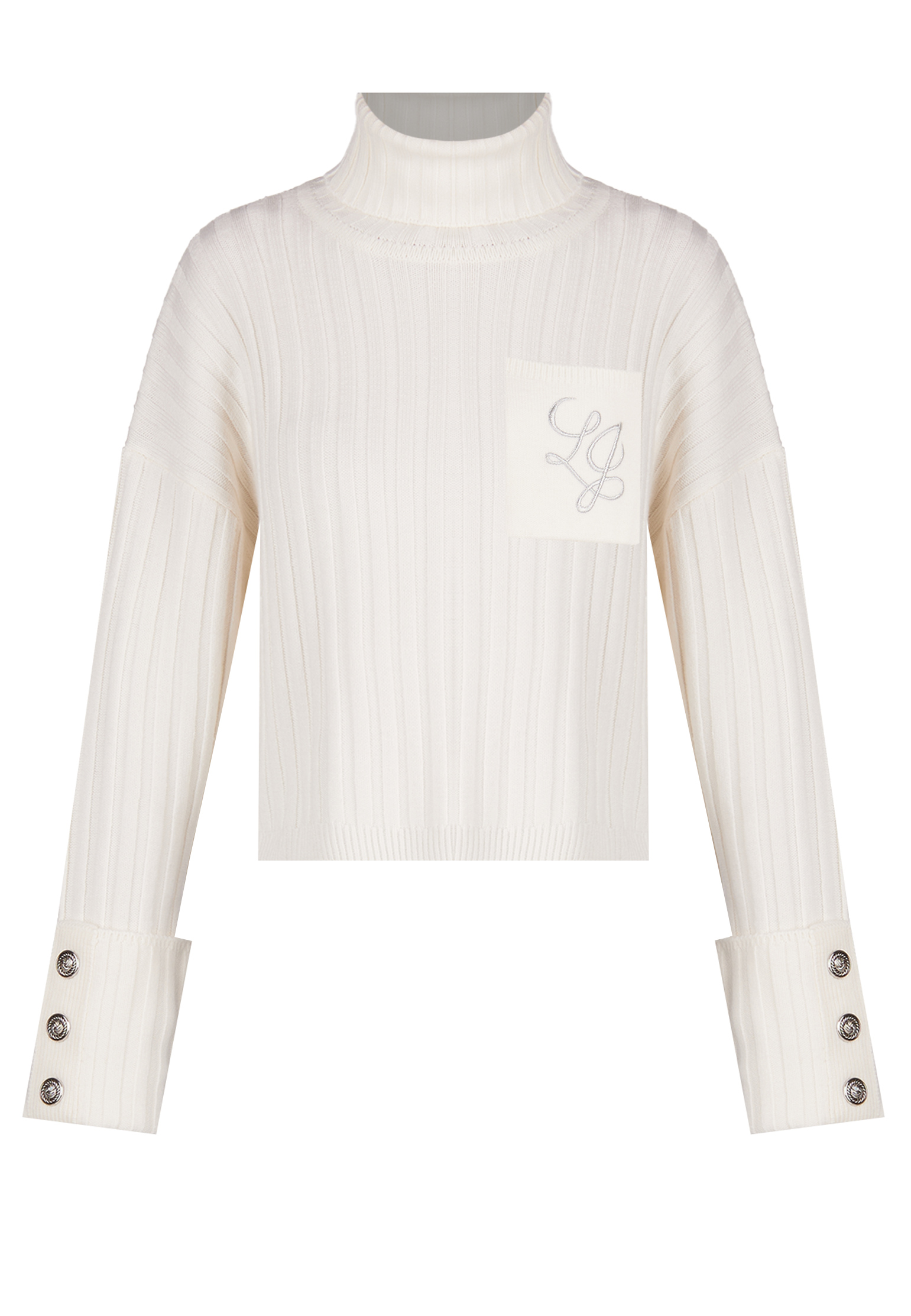 Белый короткий свитер крупной ребристой вязки — это стильный и универсальный предмет гардероба, который прекрасно сочетается с любым низом. Его основные отличительные черты — ультравысокие манжеты с декоративными пуговицами, которые не только добавляют уникальности, но и обеспечивают дополнительное тепло и комфорт. Расслабленный силуэт со спущенной линией плеч создает непринужденный и модный образ, подходящий для повседневной носки. Нагрудный карман привлекает внимание своими вышитыми инициалами бренда, добавляя нотку эксклюзивности. В составе пряжи шерсть и акрил, использованные в равных пропорциях. Шерсть известна своими теплоизоляционными свойствами и мягкостью, благодаря чему обеспечивает великолепное удержание тепла в холодный сезон. С другой стороны, акрил добавляет изделию прочности и износостойкости, не требуя при этом сложного ухода. Такая комбинация делает свитер не только стильным, но и практичным выбором на каждый день.
