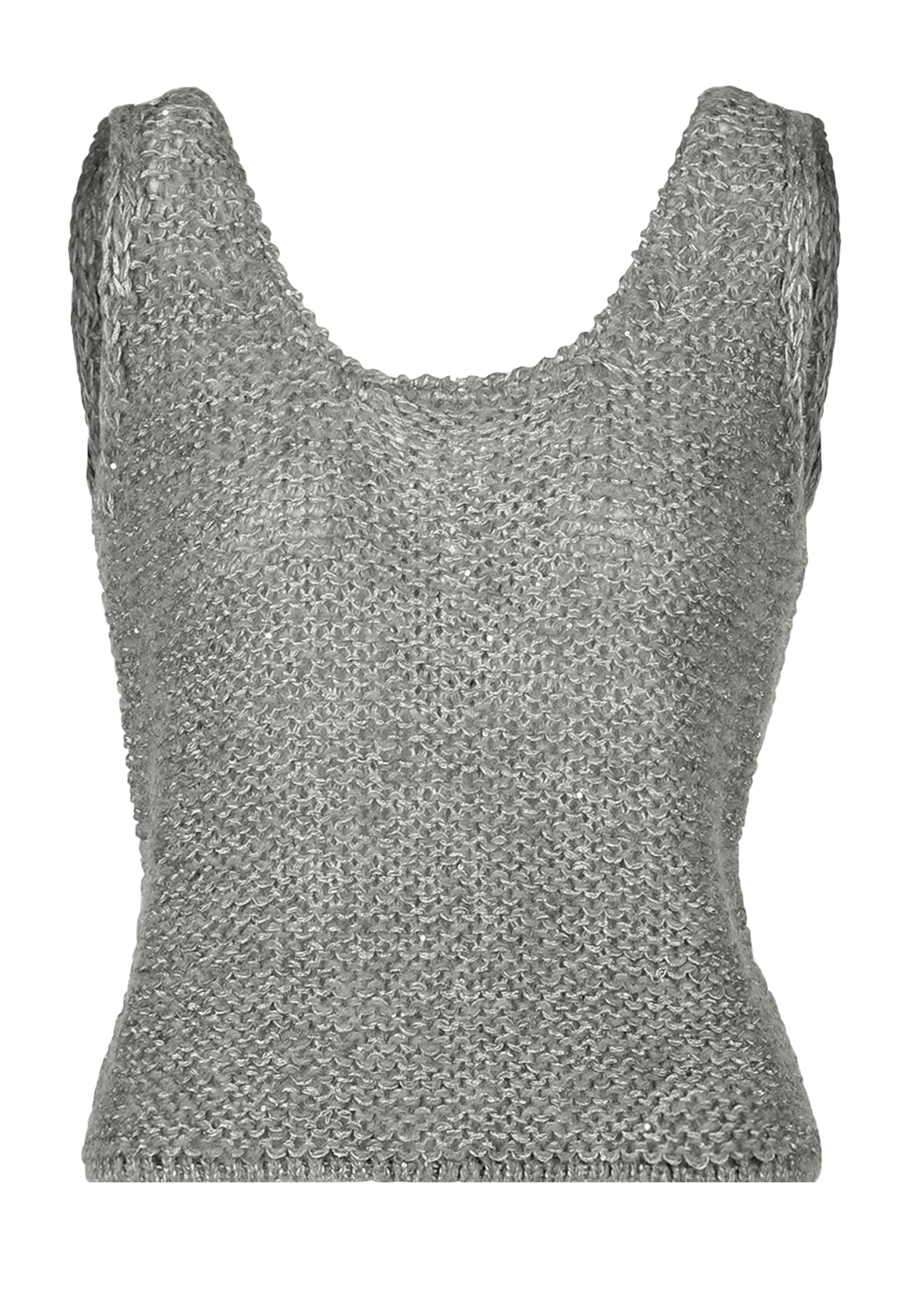 Вязаная серая майка - это идеальное сочетание лаконичного дизайна и роскошной текстуры. Модель с глубоким круглым вырезом спереди и сзади придает образу современное звучание и элегантную легкость. Уникальный состав из полиэстера (57%), альпака (26%) и шерсти (17%) создает исключительную комбинацию: полиэстер обеспечивает прочность и форму, мягкая альпака дарит невесомый уют, а шерсть добавляет тепло и упругость материала. Эта майка станет универсальной базой для создания стильных образов, идеально сочетаясь с джинсами, юбками или брюками, предлагая комфорт и утонченность в любой ситуации.