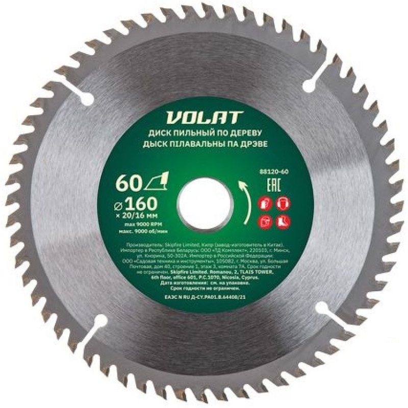 Диск пильный Волат 88120-60, 160х20/16 мм, 60 зуб. по дереву
