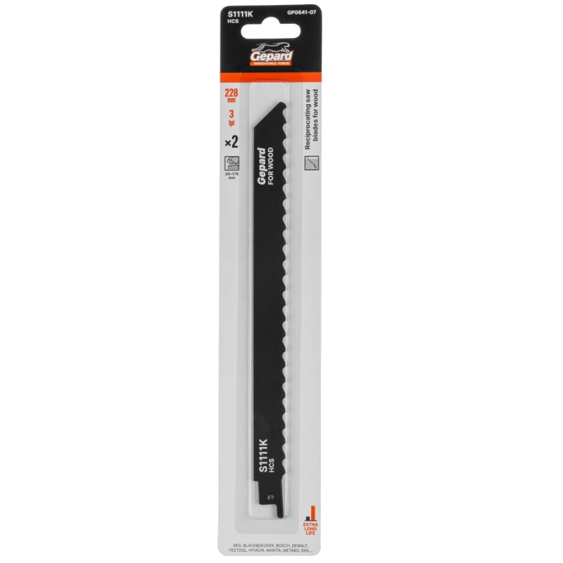 Пилка сабельная по дереву Gepard S1111K GP0641-07, 2 штуки - сменный пильный элемент для сабельных пил используется для быстрого, грубого, поперечного и продольного пиления мягкой и твердой древесины, ДСП, фанеры, пластика, грубой древесины без гвоздей, кустов и веткок, живой древесины.Преимущества Высокая производительность при грубом пилении Надежность конструкции Универсальность применения Долговечность использования Эффективность при работе с различными материалами