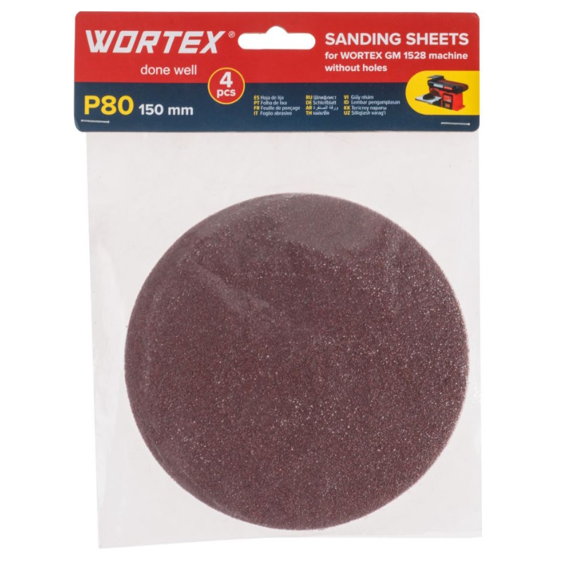 Шлифлист Wortex 1325981, для станка GM 1528, 150мм, P80, без отверстий, 4 шт.