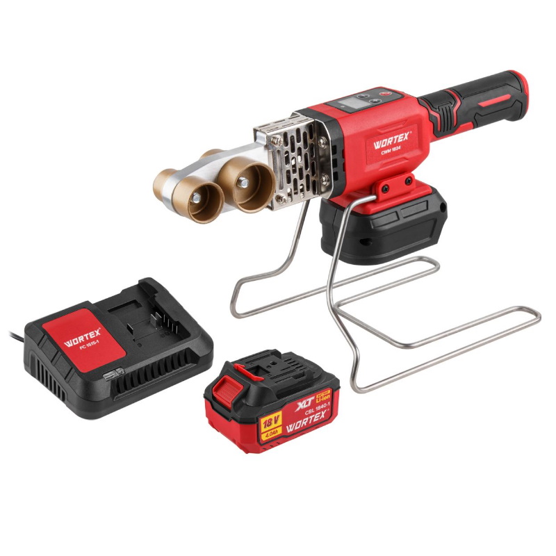 Аккумуляторный сварочный аппарат для полимерных труб Wortex CWM 1834 ALL1 XLT SET 1304777, с акб и зу+3 насадки