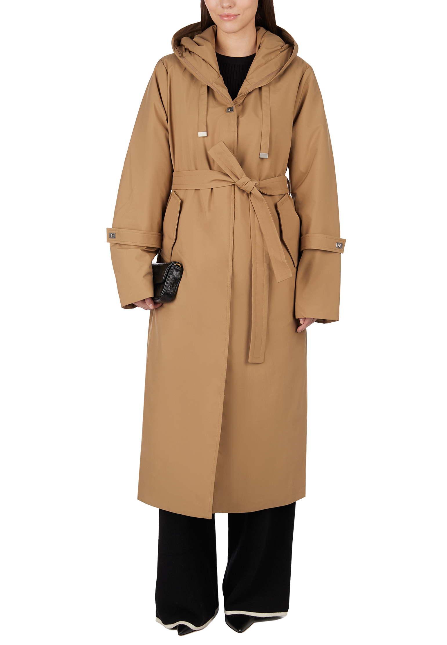 Цвет кэмел привносит в образ нотки тепла и утонченной роскоши, напоминая о том, что классика всегда в моде. Эта модель изящно стилизована под тренч, оснащена патами на рукавах, добавляющими экстравагантности и акцентирующими внимание на утонченных деталях. Капюшон на кулиске обеспечивает дополнительную защиту и стиль, а пояс-лента позволяет подчеркнуть талию, создавая элегантный силуэт.