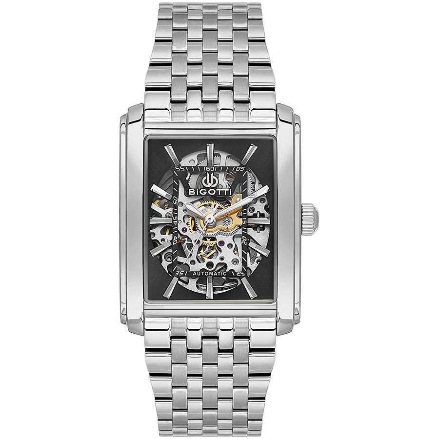 Мужские механические часы с автоподзаводом. Калибр механизма 28DOA. Центральные часовая, минутная и секундная стрелки. Черный скелетонизированный циферблат. Прямоугольный корпус выполнен из нержавеющей стали. Размер корпуса составляет 33 х 43 мм. Стальной браслет, раскладывающаяся застежка. Прочное минеральное стекло устойчивое к мелким механическим повреждениям. Водостойкость WR 50 (мытье рук, дождь).