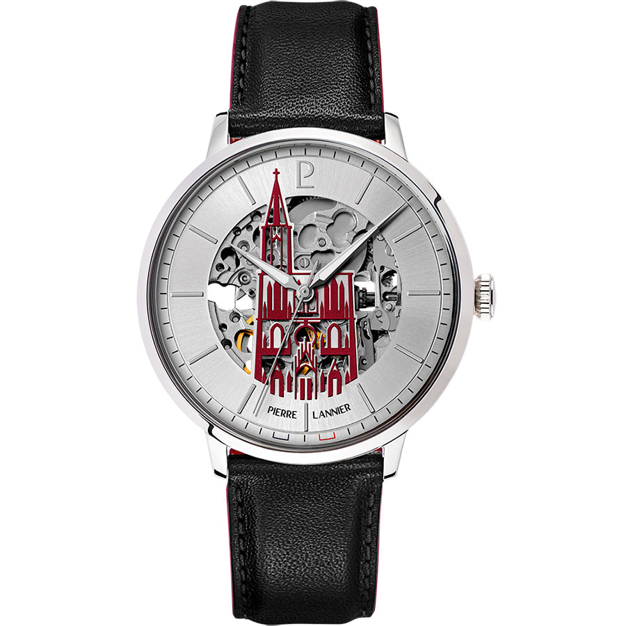 Мужские механические часы с автоподзаводом. Центральные часовая, минутная и секундная стрелки. Серебристый скелетонизированный циферблат с изображением кафедрального собора. Круглый корпус выполнен из нержавеющей стали. Диаметр корпуса составляет 42 мм, толщина 13,5 мм. Черный кожаный ремешок шириной 20 мм, стандартная застежка. Прочное минеральное стекло устойчивое к мелким механическим повреждениям. Водостойкость WR 50 (мытье рук, дождь).