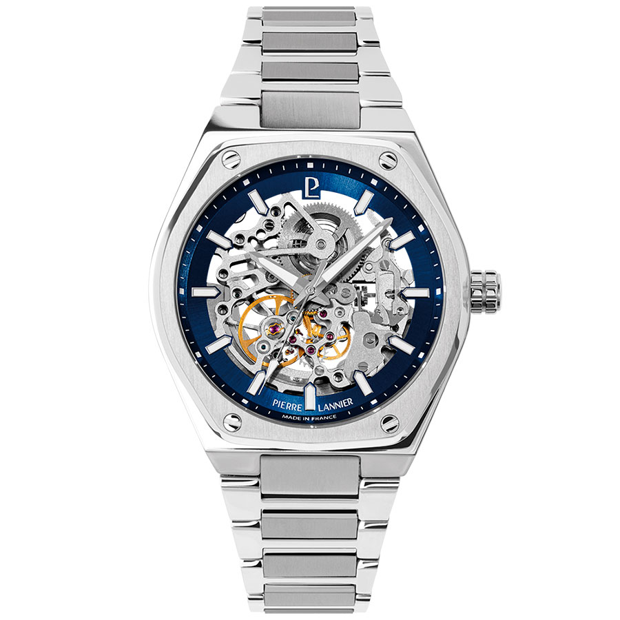 Мужские механические часы с автоподзаводом. Центральные часовая, минутная и секундная стрелки. Серебристый скелетонизированный циферблат с синим кольцом. Круглый корпус выполнен из нержавеющей стали. Диаметр корпуса составляет 42,5 мм, толщина 11,6 мм. Стальной браслет шириной 22 мм, раскладывающаяся застежка. Прочное минеральное стекло устойчивое к мелким механическим повреждениям. Водостойкость WR 50 (мытье рук, дождь).