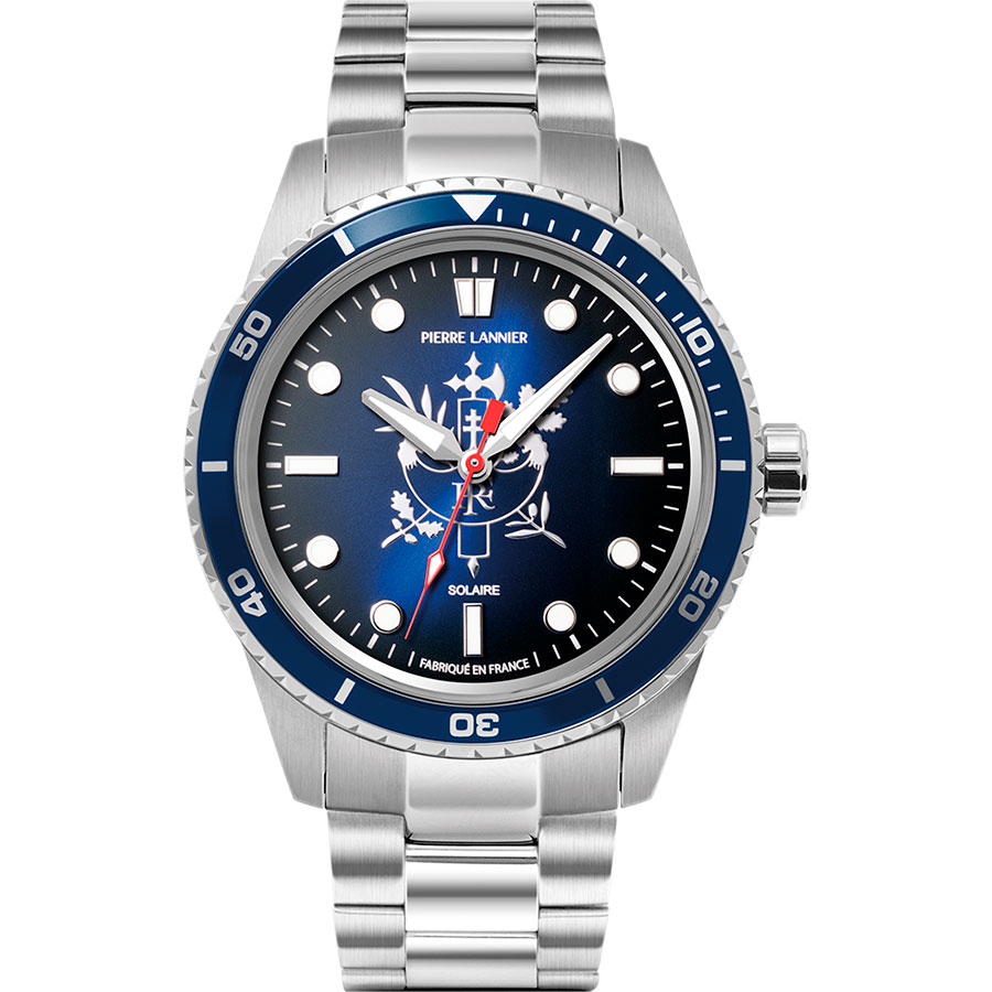 Мужские кварцевые часы на солнечной батарее. Центральные часовая, минутная и секундная стрелки. Синий циферблат. Круглый корпус выполнен из нержавеющей стали. Диаметр корпуса составляет 43 мм, толщина 9,9 мм. Стальной браслет шириной 22 мм, раскладывающаяся застежка. Прочное минеральное стекло устойчивое к мелким механическим повреждениям. Водостойкость WR 100 (плавание без погружения). Вес 153 г.