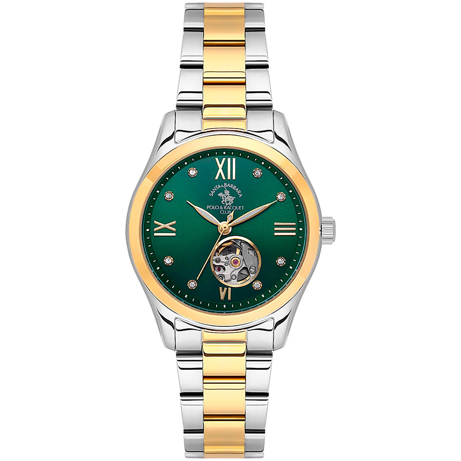 Женские механические часы с автоподзаводом. Калибр механизма Miyota 6T28. Центральные часовая, минутная и секундная стрелки. Зеленый циферблат с открытым балансом хода украшен фианитами. Круглый корпус выполнен из нержавеющей стали с частичным IP покрытием цвета желтого золота. Диаметр корпуса составляет 32 мм. Стальной браслет с частичным покрытием, раскладывающаяся застежка. Прочное минеральное стекло устойчивое к мелким механическим повреждениям. Водостойкость WR 50 (мытье рук, дождь).